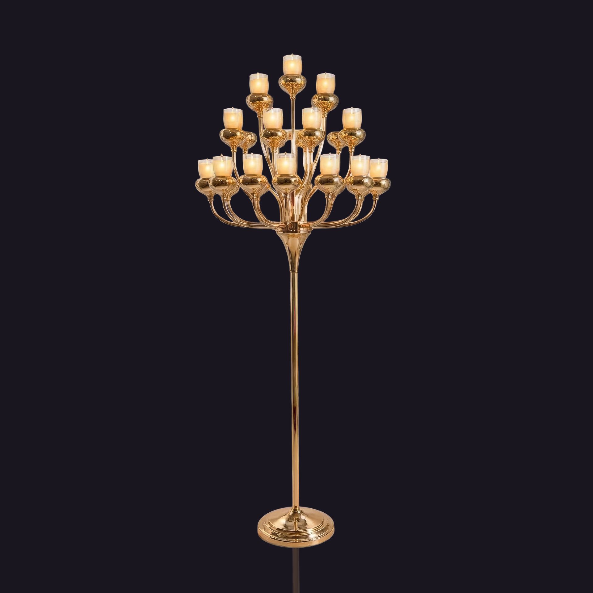 Elevate your next event with the breathtaking Grande Rose Gold Candelabra. This tall masterpiece blends architectural grandeur with a warm glow, making it the definitive focal point for weddings, galas, or sophisticated parties.