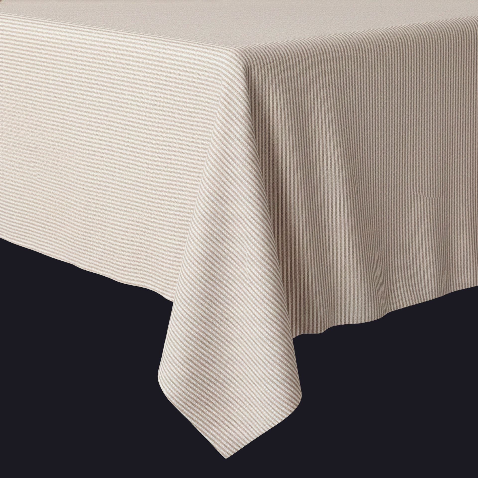 Fine sandy-beige stripes on a neutral, off-white base. This woven tablecloth features a tactile, ribbed texture that adds sophisticated detail to any table setting.